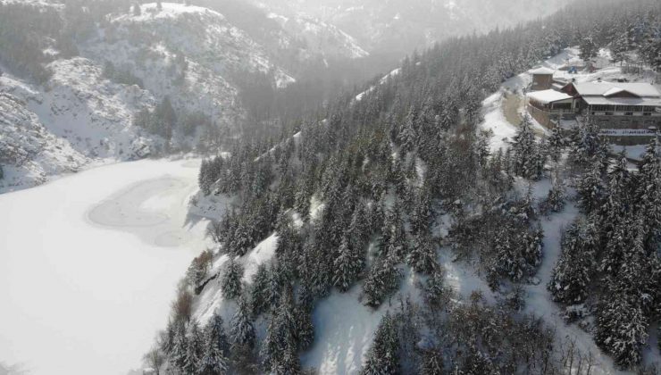 Afyonkarahisar’da yaklaşık 2 haftadan bu yana aralıklarla devam eden kar yağışı sonrası donan Erkmen Baraj Göleti ve çevresinde kar altında kalan ağaçlar adeta bir kış masalı görüntüsü oluşturdu.