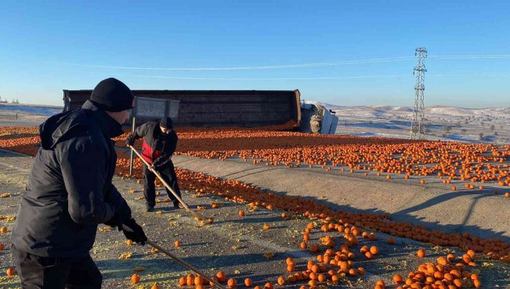 Afyonkarahisar’da kontrolden çıkarak yol ortasına devrilen tırdaki tonlarca portakal yola saçıldı. Sürücünün yaralandığı kazanın ardından karayolu uzun süre ulaşıma kapandı.