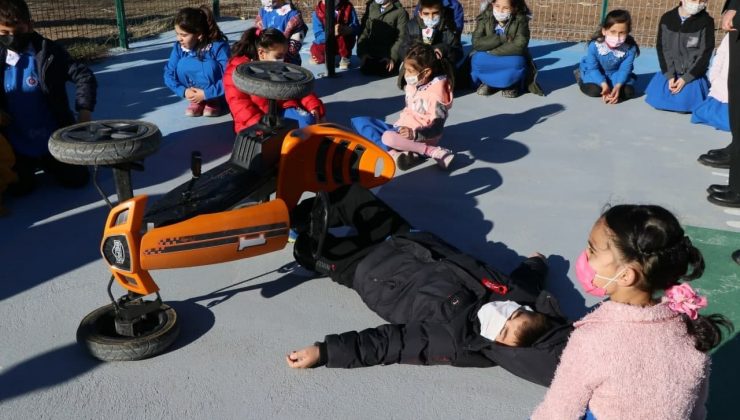 Aksaray’da minik öğrencilere uygulamalı trafik eğitimi veren jandarmanın gerçeği aratmayan eğitimi çocukları hem eğlendirdi hem de bilgilendirdi. Bir kural ihlali sonucu meydana gelen trafik kazasının canlandırılarak anlatıldığı eğitimde çocuklar yola savruldu, kullandıkları araçlar devrildi.