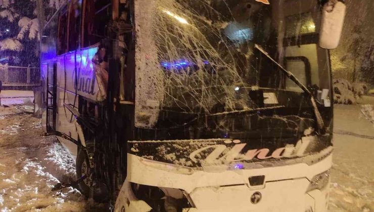 Amasya’da karla kaplı yolda kontrolden çıkan yolcu otobüsü yol kenarındaki trafik levhasına çarparak durabildi. Yaralanan 12 kişi hastaneye kaldırıldı.