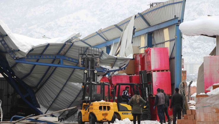 Amasya’da inşaat malzemeleri satan firmanın deposu çatısı biriken karların temizlenmeye çalışılmaya başlandığı an çöktü.