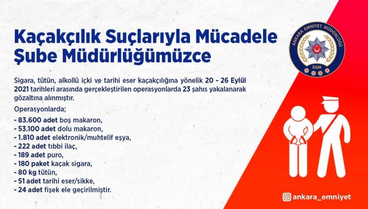 Edinilen bilgilere göre, Kaçakçılık Suçlarıyla Mücadele Şube Müdürlüğü tarafından sigara, tütün, alkollü içki ve tarihi eser kaçakçılığına yönelik 20-26 Eylül tarihleri arasında gerçekleştirilen operasyonlarda 23 kişi yakalanarak gözaltına alındı.