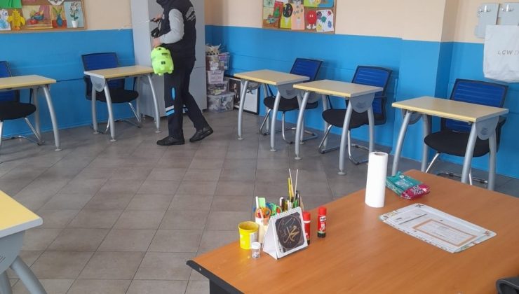 Çevre Koruma ve Kontrol Müdürlüğünce gerçekleştirilen dezenfekte çalışmalarında; derslikler, giriş kapıları, lavabolar, kapı kolları, koridorlar, idari binalar, sosyal alanlar, kafeteryalar, salonlar, eğitim materyalleri ve oyun alanları özenle dezenfekte edilerek steril hale getirildi.