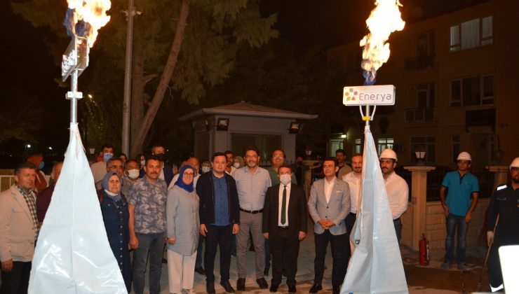 Korkuteli ilçesinde doğalgazın ilçeye getirilmesi çalışmaları kapsamında Belediye önünde ilk doğalgaz test ateşi yandı.