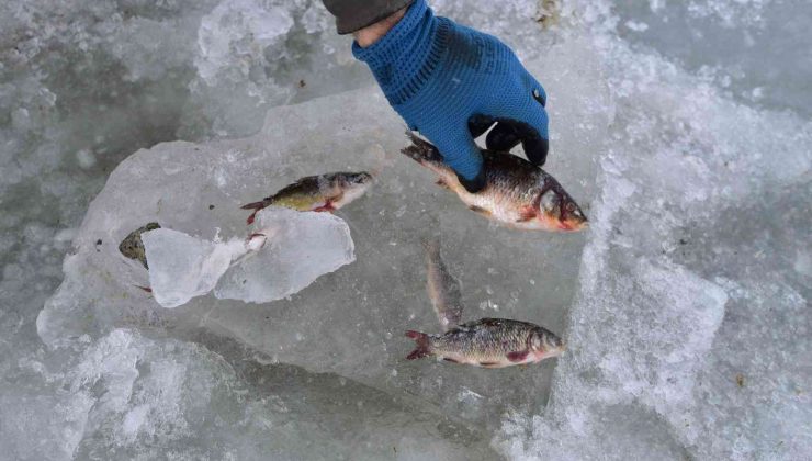 Bitlis’in Ahlat ilçesindeki Nazik Gölü, soğuk hava nedeniyle içindeki balıklarla birlikte dondu.