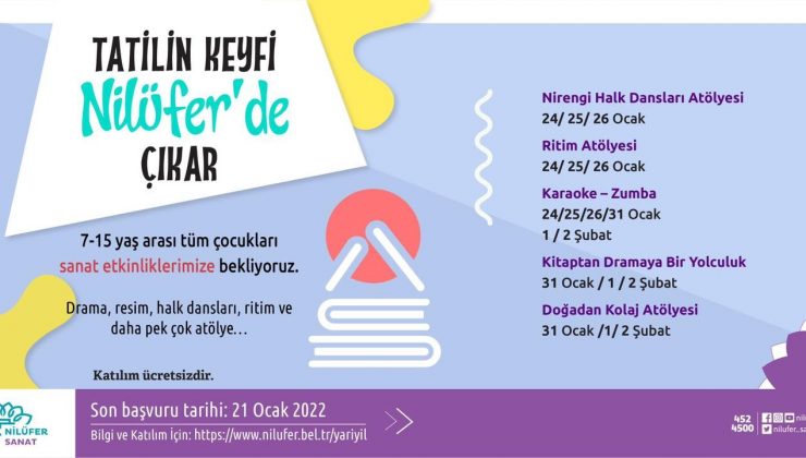 Nilüfer Belediyesi Kültür ve Sosyal İşler Müdürlüğü de, 7-10 yaş arasındaki çocukları tatilde çok çeşitli etkinliklerle buluşturacak. Ücretsiz düzenlenecek Nirengi Halk Dansları atölyesinde çocuklar geleneksel türkülerle modern dans figürlerini birleştirip halk oyunlarını öğrenecek. Ritim atölyesinde ritim çalışması yapacak olan öğrenciler, zumba ve karaoke yaparak hep beraber okul stresini üzerlerinden atabilecekler.