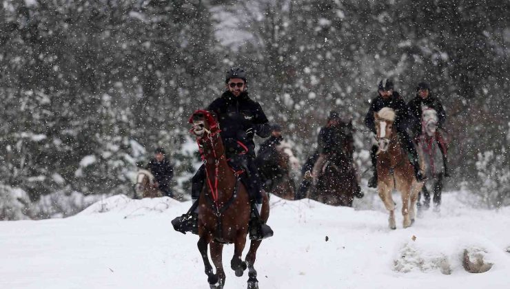 Merkezin yanındaki göletin etrafında dolaşan atların büyüleyici görüntüler oluşturduğunu belirten Şeyda Çilek Cihan, “Karda çok keyifli bir ortam oluyor ve her kesimden güzel ilgi görüyor. Merkezimizde açık, kapalı manej, ponny maneji ve self binicilik faaliyetlerimiz var. 65’e yakın atımızla 100 civarında lisanslı binicimiz var. Genelde kış sporları denildiği zaman ilk akla kayak geliyor. Ama bunun yanı sıra binicilik de çok farklı ve güzel bir spor dalı. Arazi ve orman turlarında at binmeyi bilmenize gerek yok. Herhangi binicilik geçmişiniz olmasına da gerek yok. Bu turlara katılmak için bir atınızın olmasına da gerek yok. Siz buraya geldiğinizde tüm binicilik ekipmanları size temin ediliyor. Profesyonel antrenör eşliğinde arazide karların üstünde at sürmenin keyfini çıkartabiliyorlar” diye konuştu.