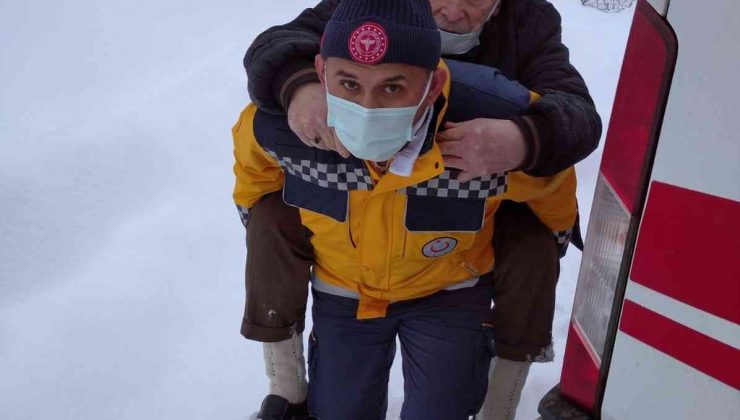 DÜZCE(İHA) – Düzce’nin Gümüşova ilçesinde fedakar sağlık görevlisi, yolu kardan kapanan ve göğüs ağrısı çeken 79 yaşındaki hastayı ambulansa kadar sırtında taşıdı.