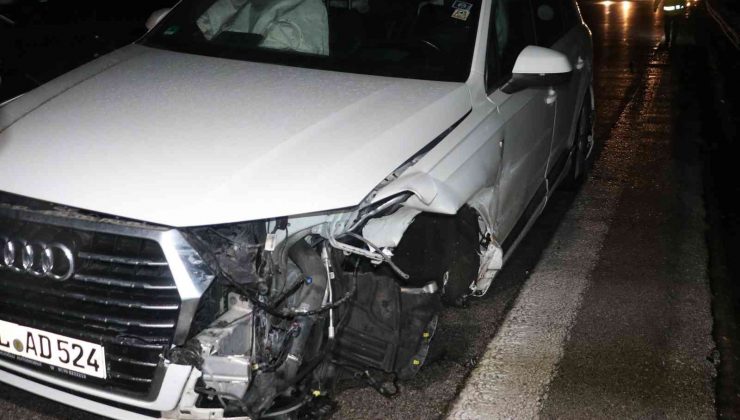 Edirne’de kar yağışı nedeniyle kayganlaşan yolda fren yapan Alman plakalı gurbetçi otomobili, başka bir araca arkadan çarptı.