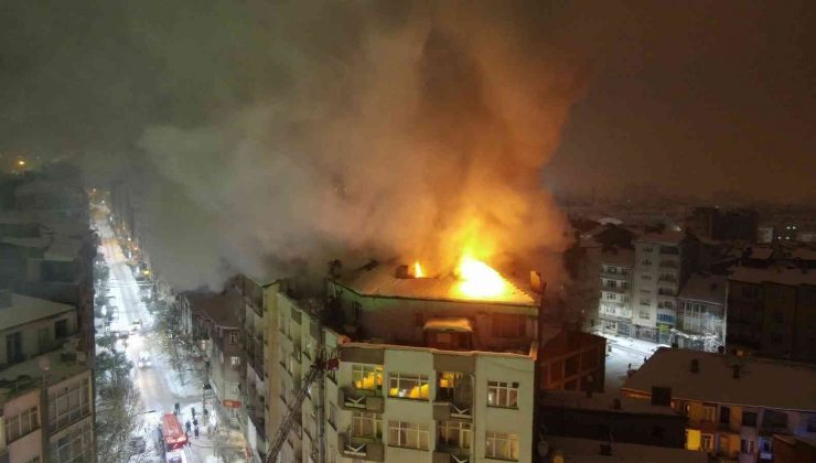 Elazığ’da 6 katlı bir binanın çatı katında yangın çıktı. Alevler 3 binanın daha çatısına sıçrarken ekiplerin yangına müdahalesi sürüyor.