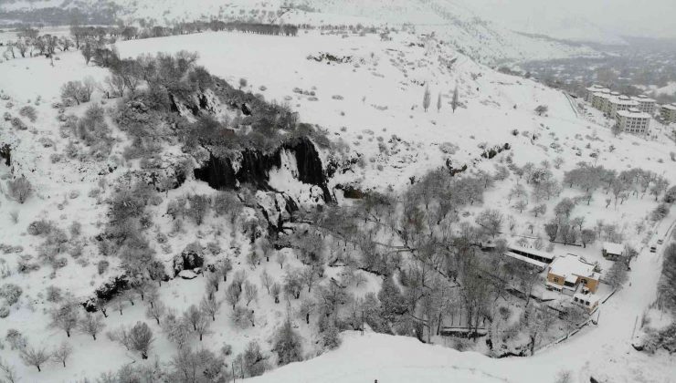 Kar yağışı ile beyaza bürünerek adeta beyaz gelinliğini giyen Erzincan’daki Girlevik Şelalesi’nde seyrine doyumsuz manzaralar oluştu.