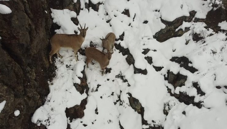 Erzincan’da yerleşim alanına yakın bir noktada kardan beyaza bürünmüş yamaçlarda gezinen dağ keçileri, drone ile havadan görüntülendi.