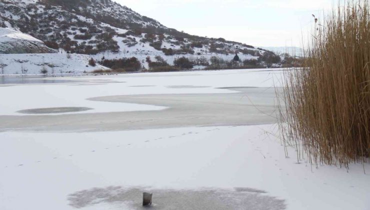 Eskişehir’de soğuk havanın etkisiyle yüzeyinin büyük bölümü buz tutan Sarısungur Göleti kartpostallık fotoğraf kareleri oluşturdu.