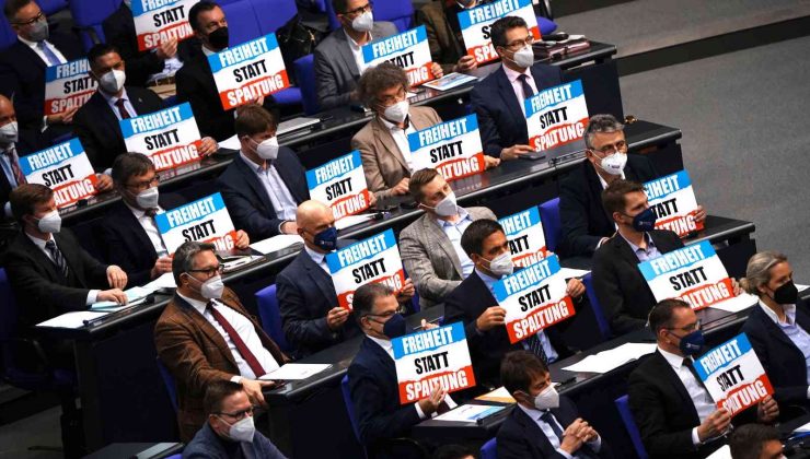 Almanya Başbakanı Olaf Scholz’un meclis oturumunda “Aşı mecburi hale gelmeli” sözleri esnasında konuşmasını kesen Almanya için Alternatif Partisi (AfD) vekilleri pankart açarak Scholz’u protesto etti.