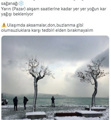 İstanbul Valisi Ali Yerlikaya, sosyal medyadan yaptığı paylaşım ile İstanbulluları yoğun kar yağışı için uyardı. Yerlikaya paylaşımında, “Meteoroloji Bölge Müdürümüzün verdiği bilgilere göre İstanbul’da bu gece kuvvetli kar ve gök gürültülü kar sağanağı, yarın (Pazar) akşam saatlerine kadar yer yer yoğun kar yağışı bekleniyor. Ulaşımda aksamalar, don, buzlanma gibi olumsuzluklara karşı tedbiri elden bırakmayalım” ifadelerine yer verdi.