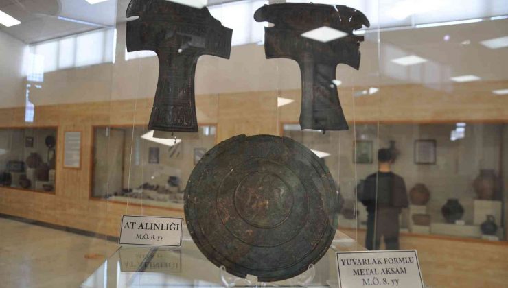 Çetin, “Müzemizin 2015 yılında Ağrı ilinde yakalanan 88 tane Urartu eseri getirilmiş olup, bunların üzerinden çivi yazılarından bunlar Kral Argişli dönemine ait olarak tarihlendirilmektedir. Milattan önce 8’inci yüzyıla tarihlendirilmemdedir. Bunlardan 10 tanesini ilk defa depomuzdan çıkardık ve restorasyon işlevleri, konservasyon işlevleri tamamlandıktan sonra sergi şu gördüğünüz şekilde bir sergi çalışmaları geliştirdik. Tabi bu sergi çalışmamız yıl boyu devam edecek. Bizim ‘1 yıl 6 sergi’ konsepti adı altında 2 aylık dönemler halinde müzemizin deposunda bulunan farklı eserleri, farklı guruptan eserleri bu şekilde sergileyip ziyaretçilerimizin bunları görmesini sağlamayı planlıyoruz. Bu eserlerimizden de ilk gurup olan Urartu eserlerimizden gümüş kaburga gövdeli kablar, yine arkamda gördüğünüz gibi çok önemli bir eser olan Gümüş ve Altın işlemeli bir sitular, situlalar dinsel törenlerde kullanılan kablardır. Urartular döneminde törenlerinde kullanılmaktadır. Yine Pektoral dediğimiz göğüslük özellikle Pektoral ve At alınlığı hemen önündeki yuvarlak metal aksam, bunlar at savaş atlarına Urartuların yerleştirmiş oldukları metal eserlerdir. Bunun dışında tabi bu sergimizin amacı şehrimize gelen özellikle bu dönemde şehrimizin yoğun ziyaretçi sayısının olduğu bu dönemlerde gelen ziyaretçilerimizin depolarımızda da ne tür eserlerimizin olduğunu, sadece daimi olan sergiler dışında geçici olarak sergilediğimiz eserlerinde bu bölgenin ne kadar zengin bir kültürel varlığa sahip olduğunu göstermektir” dedi.
