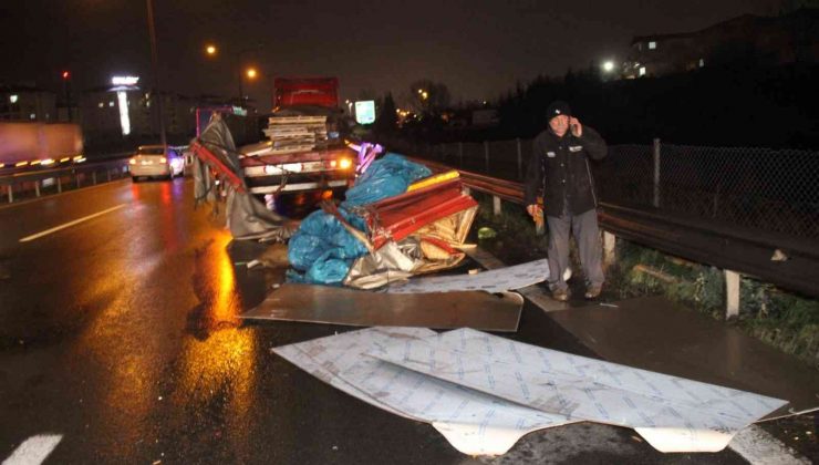 E.B. idaresindeki kamyonetin sac levhalara çarpmasıyla yakıt deposu patladı. Yola dökülen yakıtın yangına sebep olmaması olası bir faciayı önlerken, tırlar ve kamyonetin sürücüleri kazadan yara almadan kurtuldu.
