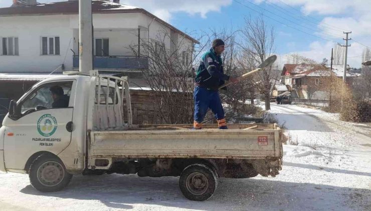 Pazarlar Belediyesi Fen İşleri ekiplerince, buzlanmayı önlemek amacıyla yapılan kar küreme ve tuzlama çalışmalarında bugüne kadar yaklaşık 100 ton tuz kullanılırken, çalışmaların yer yer devam ettiği belirtildi.