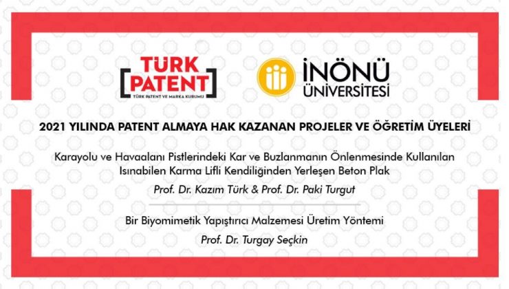 İnönü Üniversitesi Kimya Bölümü Öğretim Üyesi Prof. Dr. Turgay Seçkin’in “Bir Biyomimetik Yapıştırıcı Malzemesi Üretim Yöntemi” başlıklı buluşu incelemeli olarak patent alırken, İnşaat Mühendisliği Bölümü öğretim üyeleri Prof. Dr. Kazım Türk ve Prof. Dr. Paki Turgut’un “Karayolu ve Havaalanı Pistlerindeki Kar ve Buzlanmanın Önlenmesinde Kullanılan Isınabilen Karma Lifli Kendiliğinden Yerleşen Beton Plak” başlıklı buluşu ise Patent Belgesi almayı başardı.