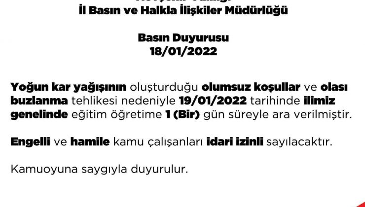 Olumsuz hava koşulları eğitimi de engelledi. Nevşehir Valiliğinden yapılan yazılı açıklamaya göre, yoğun kar yağışının oluşturduğu olumsuz koşullar ve buzlanma tehlikesi nedeniyle yarın Nevşehir genelinde eğitim öğretime 1 gün ara verildi. Engelli ve hamile kamu çalışanlar ise 1 gün idari izinli sayılacak.
