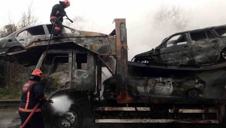 TEM Otoyolu Sakarya geçişinde 2’nci el araçları taşıyan tırda yangın çıktı. Kısa sürede alev topuna dönen tır ile dorsesinde taşıdığı 4 araç küle döndü. Araçların alev alev yandığı anlar ise saniye saniye kaydedildi.