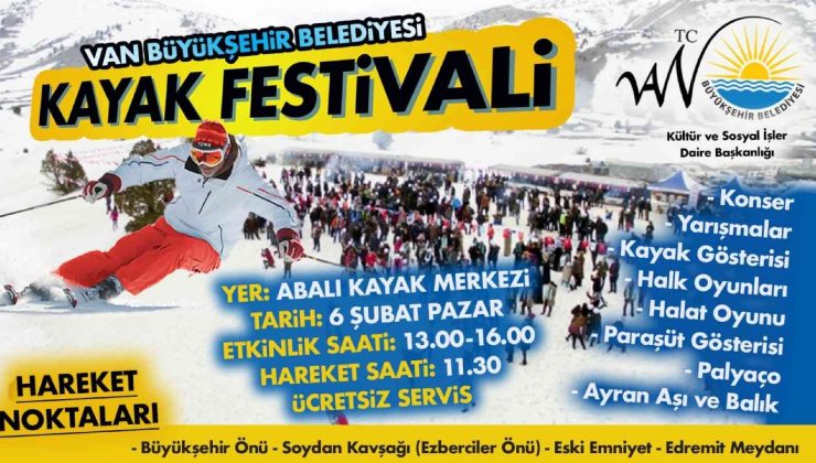 Van Büyükşehir Belediyesinden yapılan açıklamada, kentte kayak turizmini canlandırmak için “Kayak Festivali” düzenleneceği belirtilerek, “Kültür ve Sosyal İşler Dairesi Başkanlığı organizasyonunda düzenlenecek olan ‘Kayak Festivali’ 06 Şubat Pazar günü 13.00- 16.00 saatleri arasında Gevaş Abalı Kayak tesislerinde yapılacak. Festival alanına Edremit Meydanı, Soydan Kavşağı, büyükşehir belediyesi hizmet binası önü ve eski emniyet binası önünden saat 11.30’da hareket edilecek. Festival alanında kayak gösterisi, konser, halk oyunları, halat çekme yarışı ve kızak çekme yarışı gibi etkinlikler yapılacak. Yine festival sonunda katılımcılara ekmek arası Van balığı, ayran aşı, sıcak çay ve çorba ikramın da bulunulacak” denildi.